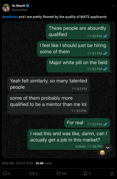 This tweet recently highlighted two MATS mentors talking about the absurdly high qualifications of incoming applications to the AI Safety Fellowship: