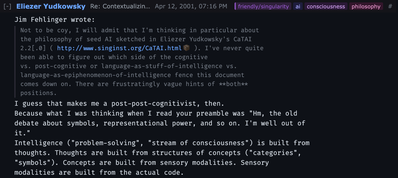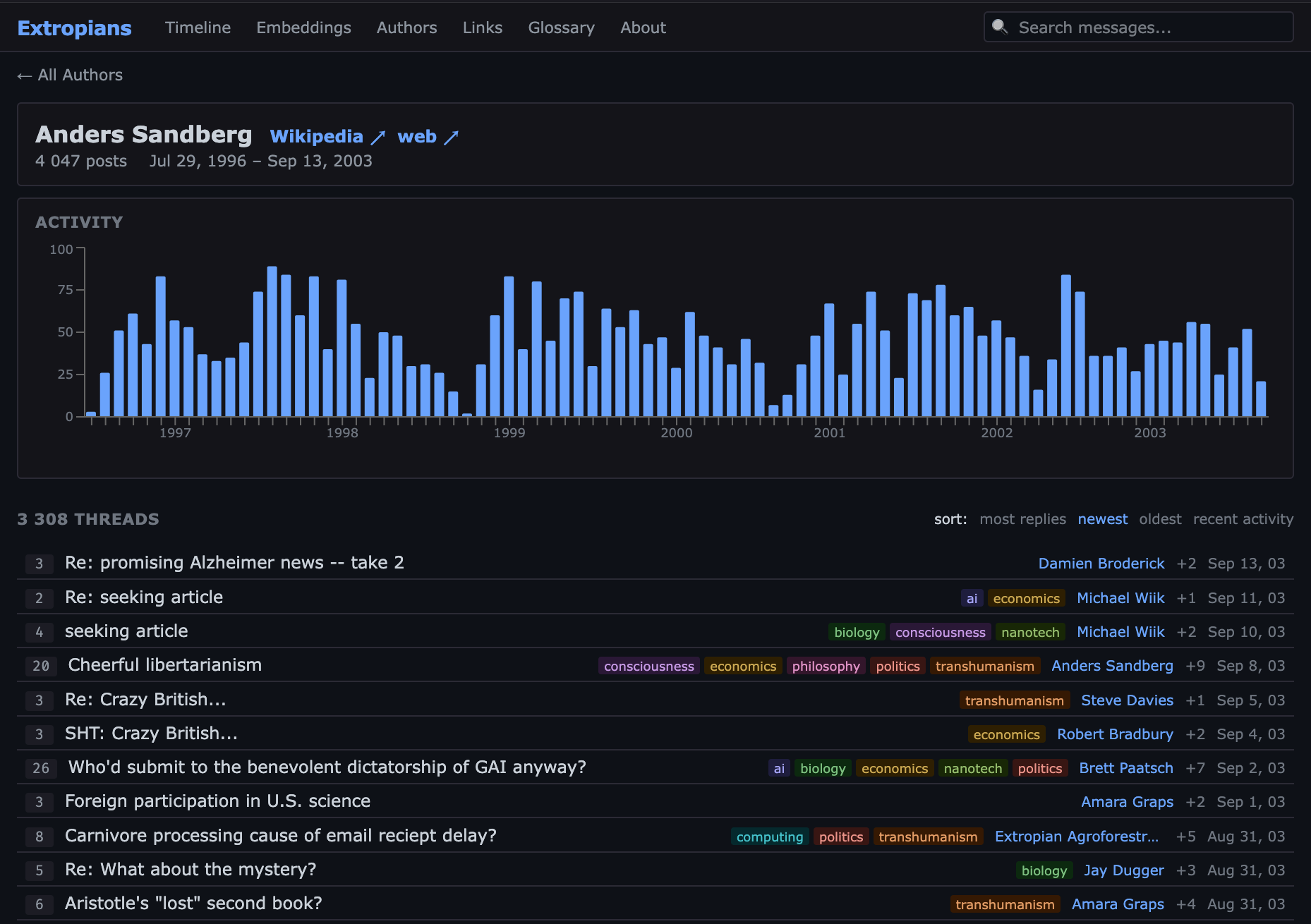 Claude & I vibecoded an interface for the extropians mailing list. It’s live! Have a look here: https://extropians.boydkane.com/.