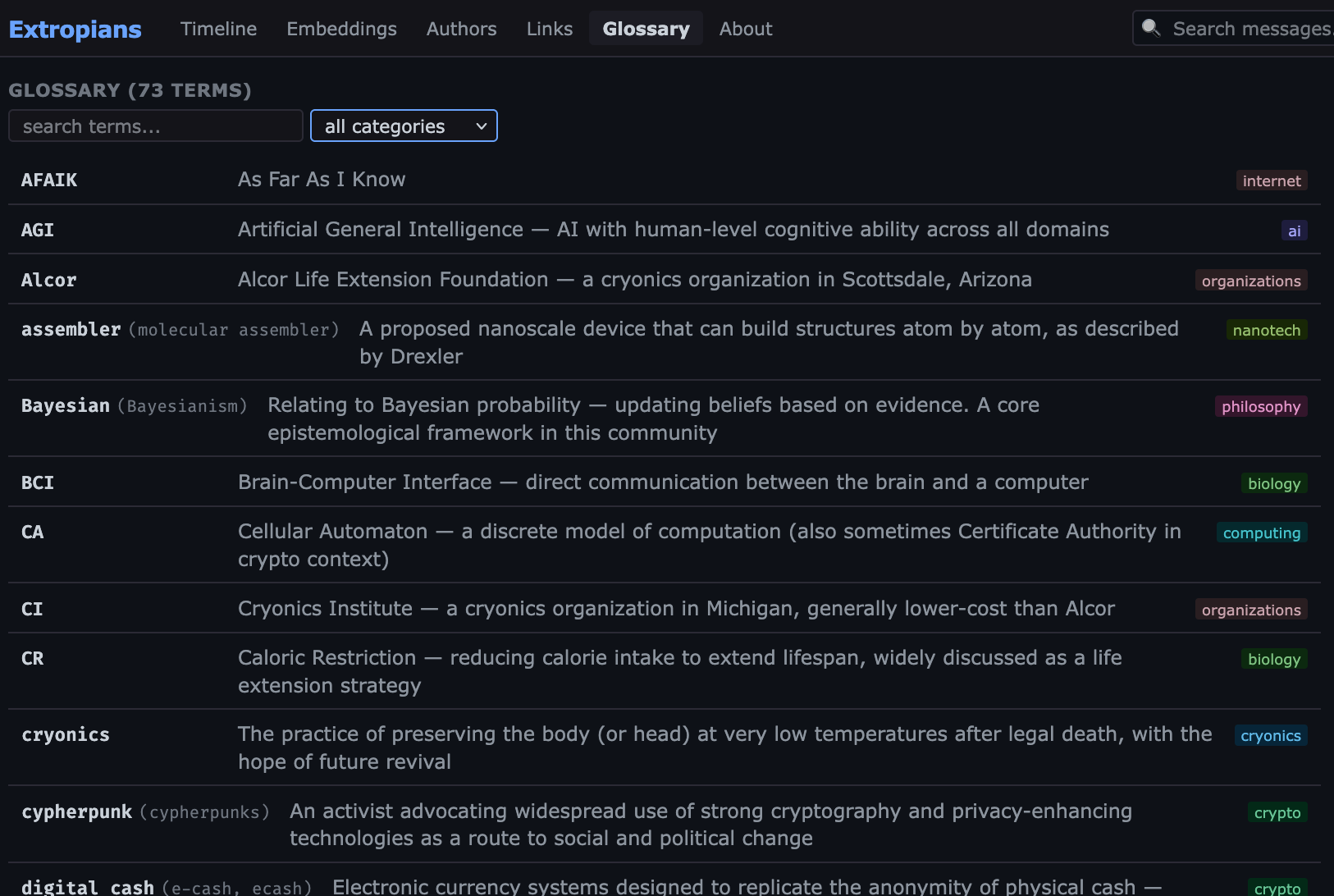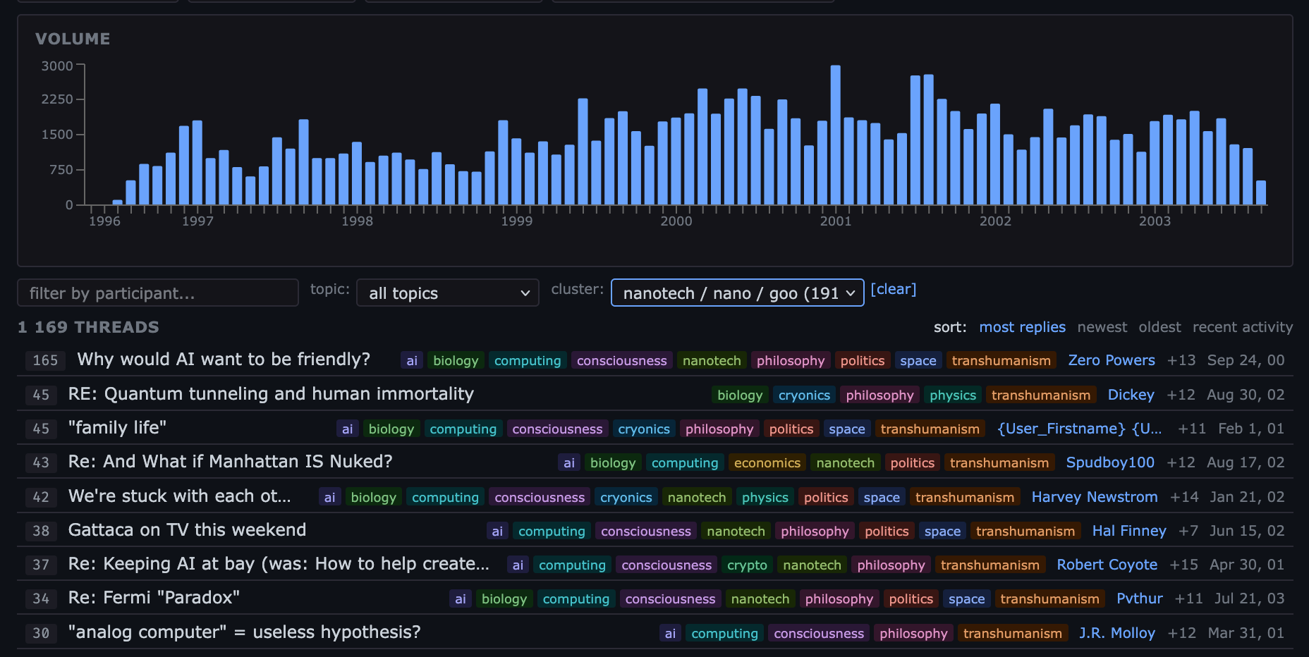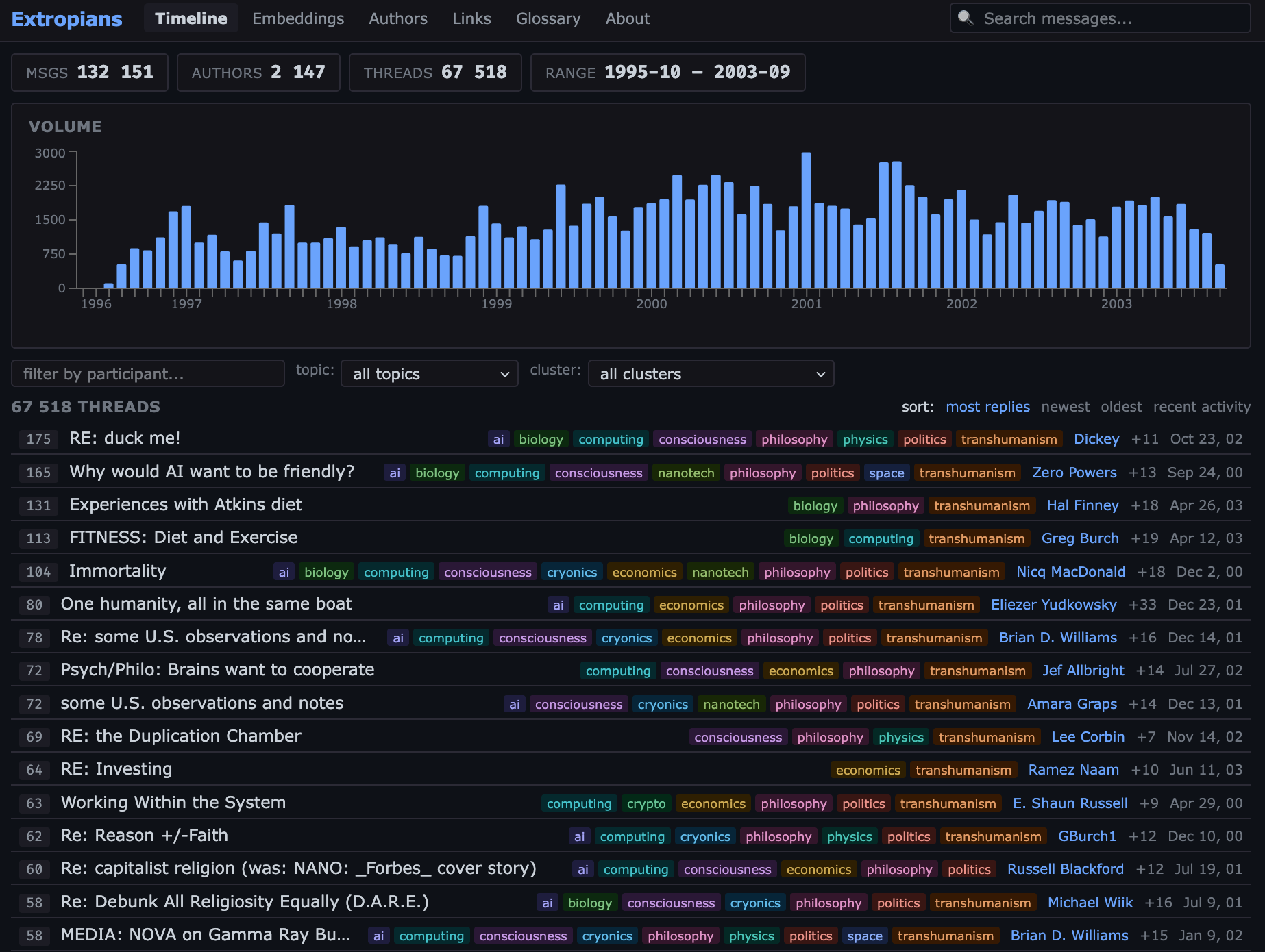 There’s 130k messages spread out over ~8 years from 2k unique authors, discussing topics including mars, cryonics, nanotech, morality, AI, politics, etc.