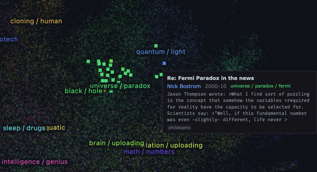 This is just running on a smol server, so there’s no semantic search, but I did pre-cluster the embeddings and label them, so you can search for specific clusters.