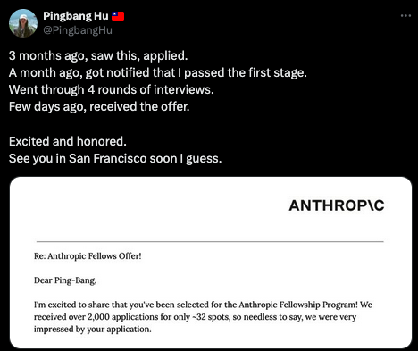 Another was from a recently-announced Anthropic fellow, one of 32 fellows selected from over 2000 applications, giving an acceptance rate of less than 1.3%: