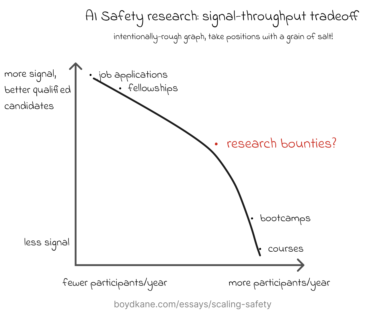 Research bounties are potentially a very scalable way to perform The Sort and find people from across the world who are able to make AI safety research breakthroughs. There are problems with research bounties, but there are problems with all options (fellowships, bootcamps, courses, etc) and the only valuable question to ask is whether the problems outweigh the benefits. I believe research bounties could fill a gap in the throughput-signal Pareto curve, and that this gap is worth filling.