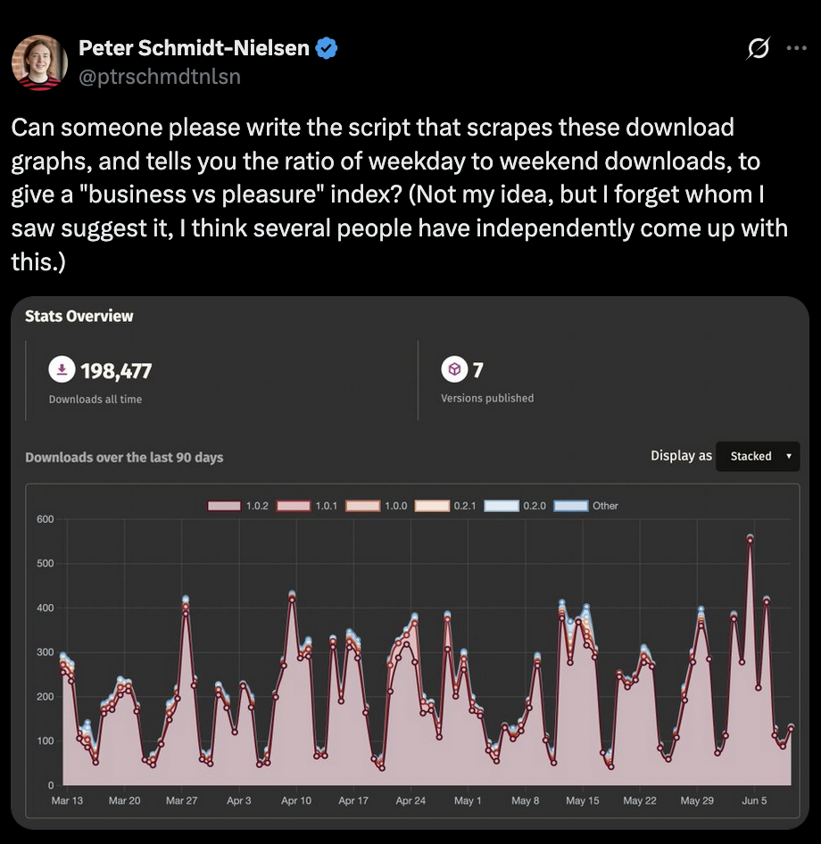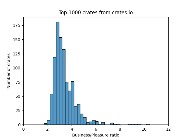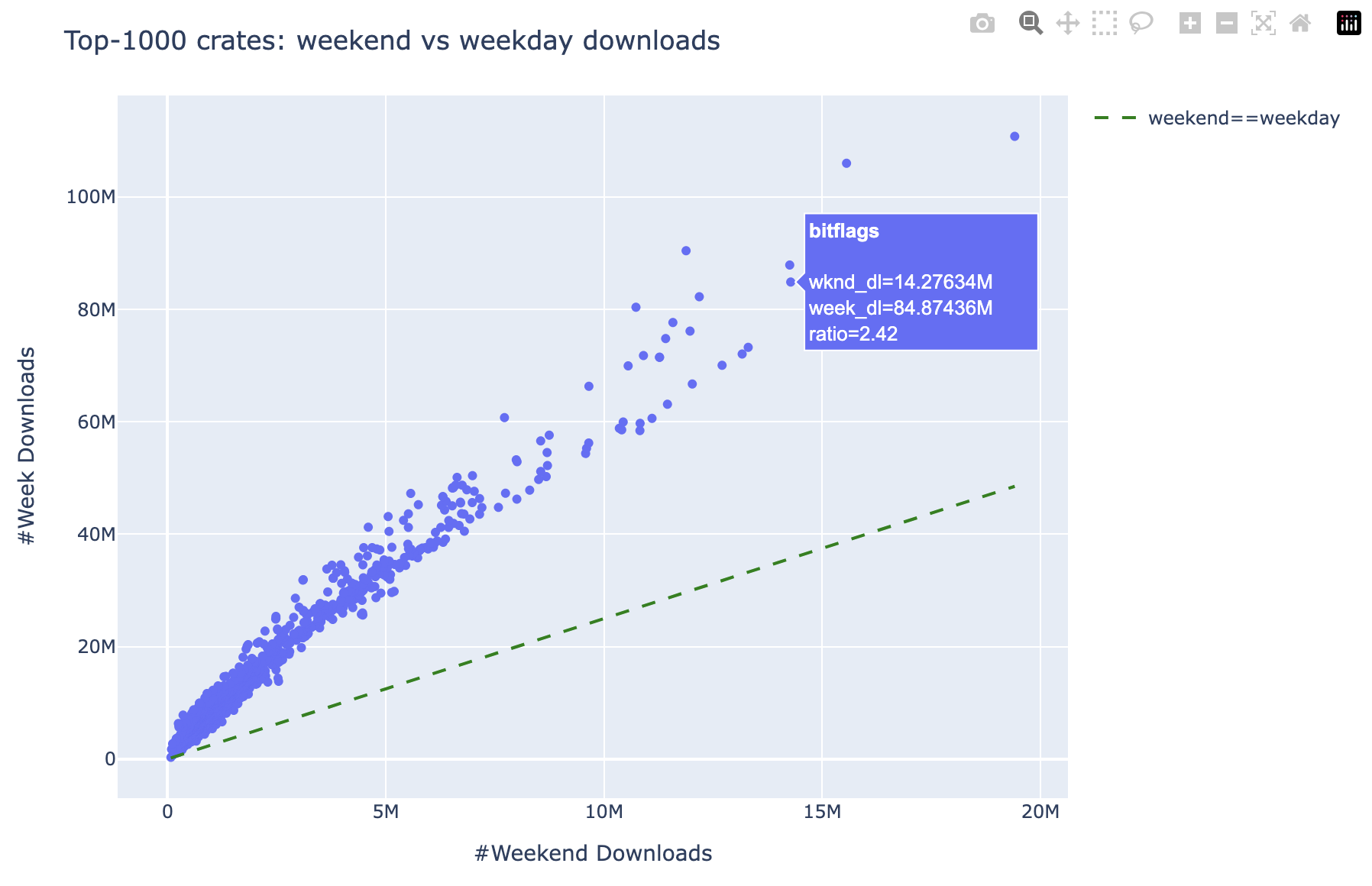It’s a very tight band, barely any crate with any significant number of downloads has more than 5x or less than 2x the number of downloads on weekdays vs weekends. This is also visible from the statistics, the standard deviation is just 0.93: