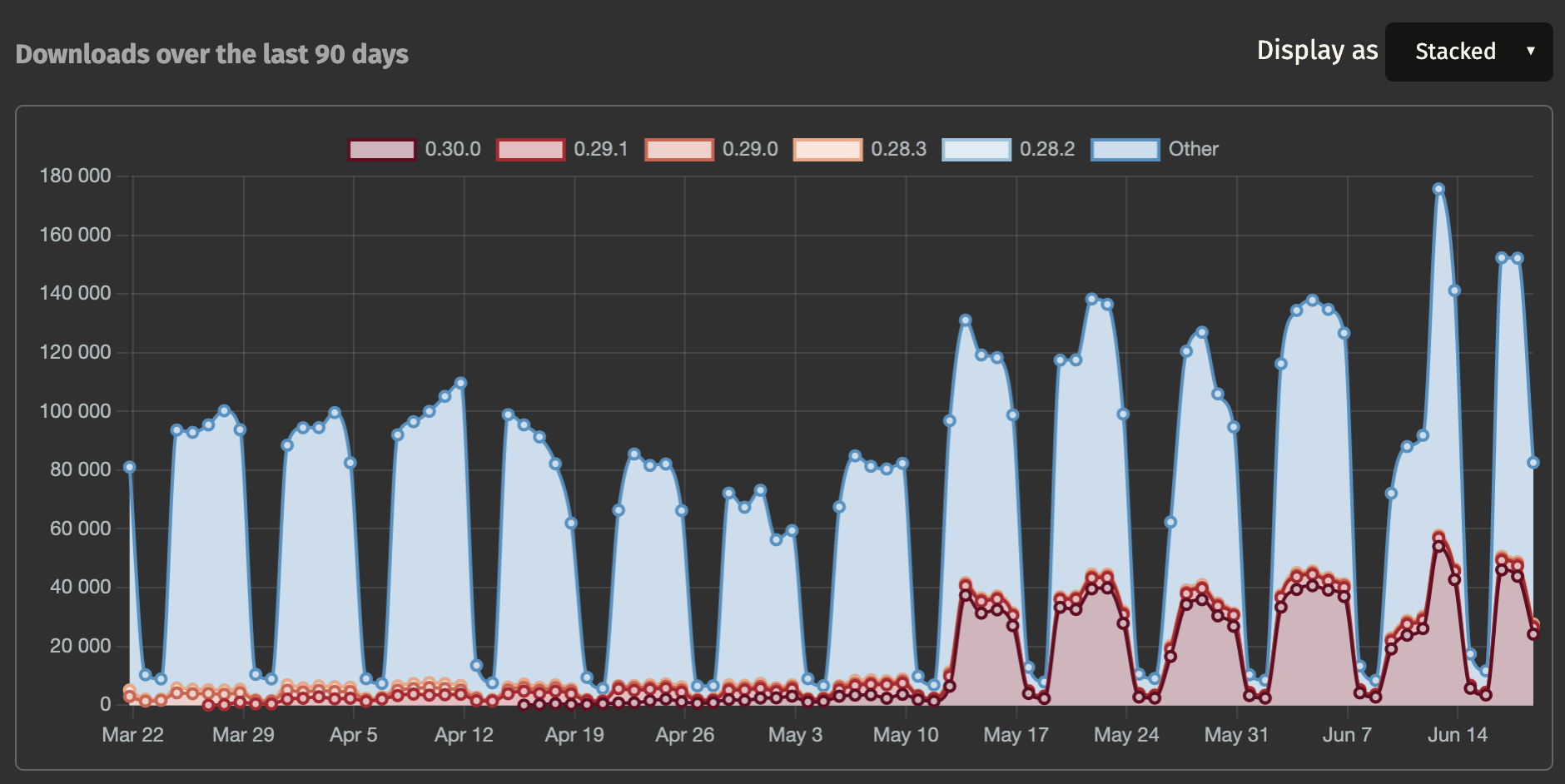 It’s interesting to see a slight curve to the points, indicating that crates seem to get lots of adoption during the week, but then later in life they turn to be more downloaded on the weekends. That’s the opposite of what I expected! I was expecting the smaller crates to be discovered by hobbyists and then gradually trickle into business use-cases.