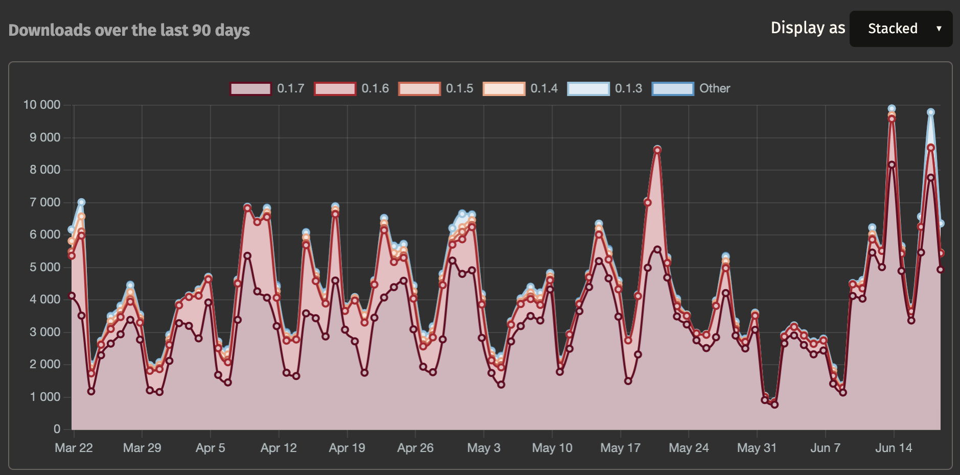 It seems like the hobbyists like proc-macro hackery! (or more likely, proc-macro-nested just has very very few downloads). Here’s the crates.io graph of downloads over time, you can see it’s still spiky but much less emphasised towards the weekends. It also doesn’t have that many absolute downloads (none of the least-downloaded-crates-during-the-week do) so it’s likely that a few power-users can skew these data.