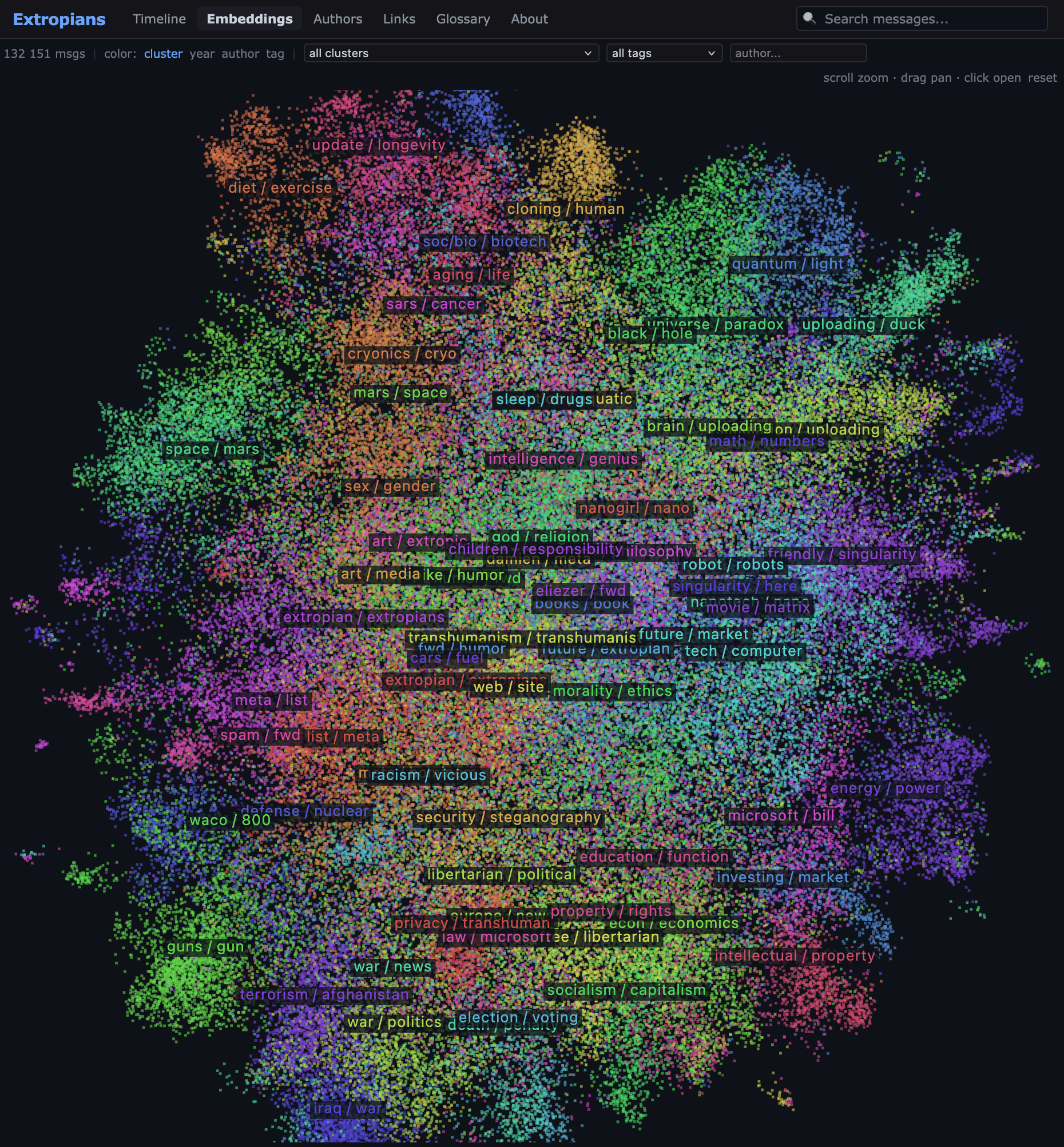 This is just running on a smol server, so there’s no semantic search, but I did pre-cluster the embeddings and label them, so you can search for specific clusters.