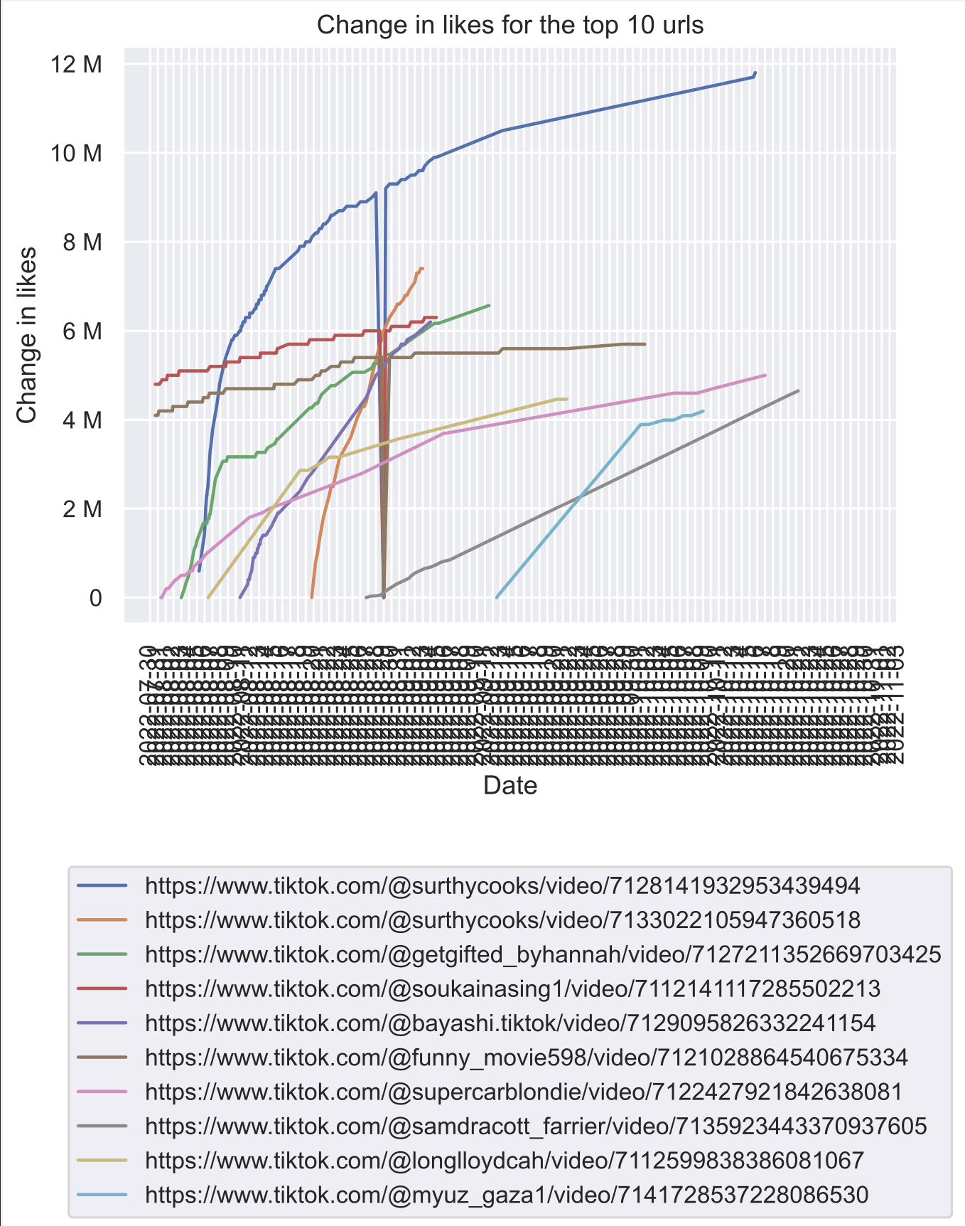 This plot shows the TikToks which had the greatest change in the number of likes, even the “least” viral TikToks in this plot grow by over a million likes in just a few days.